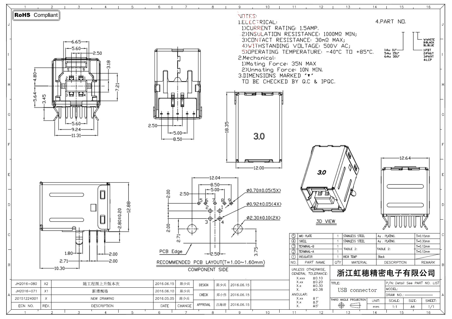 3.0USB插座技術參數: