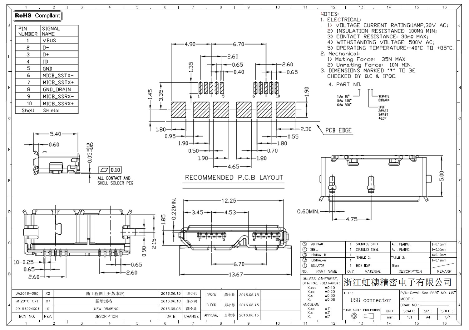 MICRO USB插座技術參數: