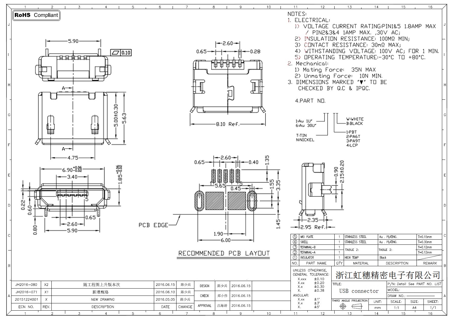 MICRO USB插座技術參數: