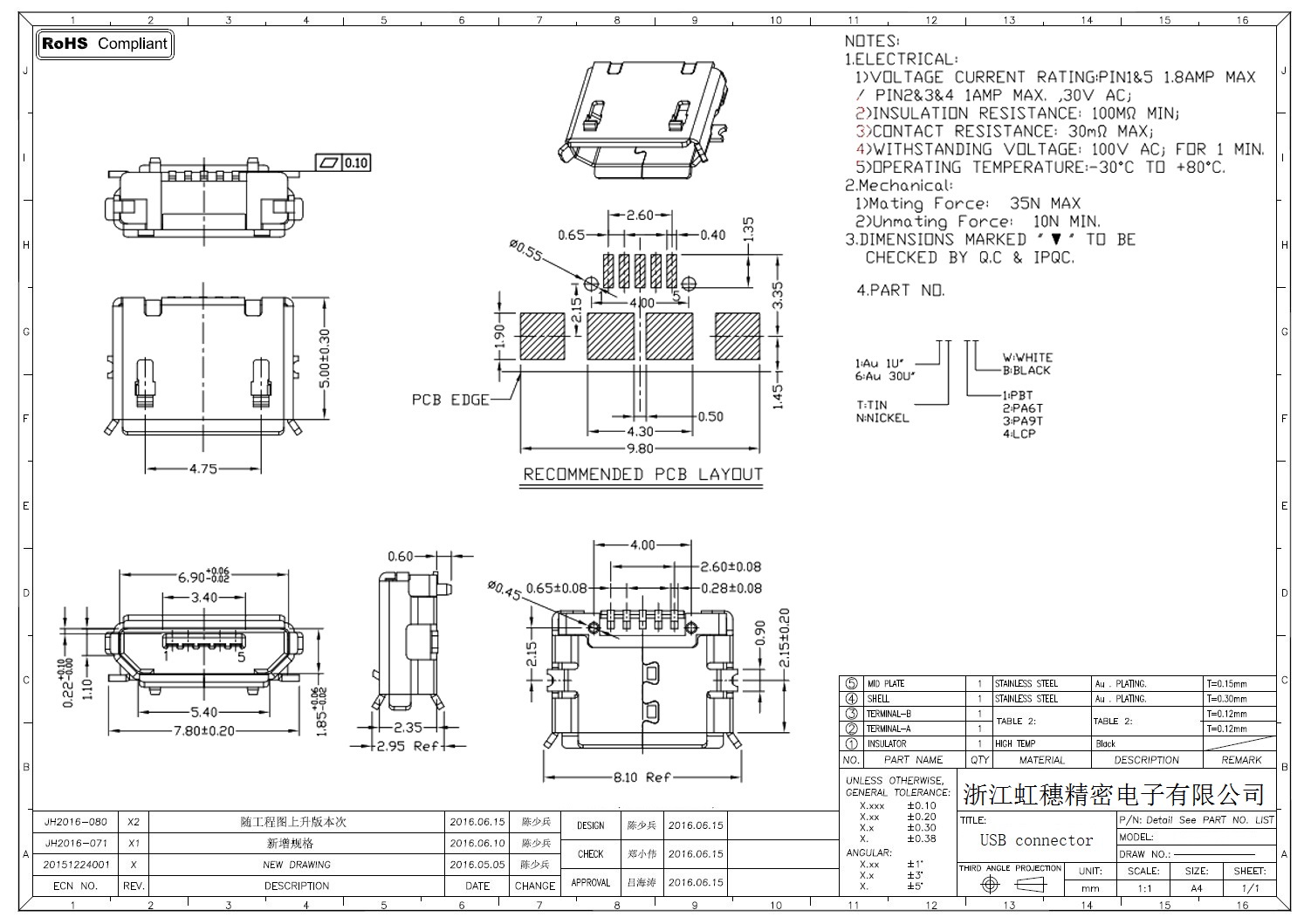MICRO USB插座技術參數: