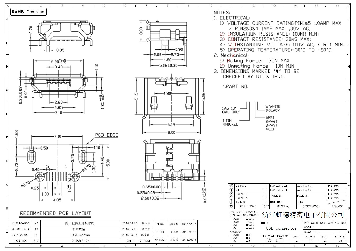 MICRO USB插座技術(shù)參數(shù):