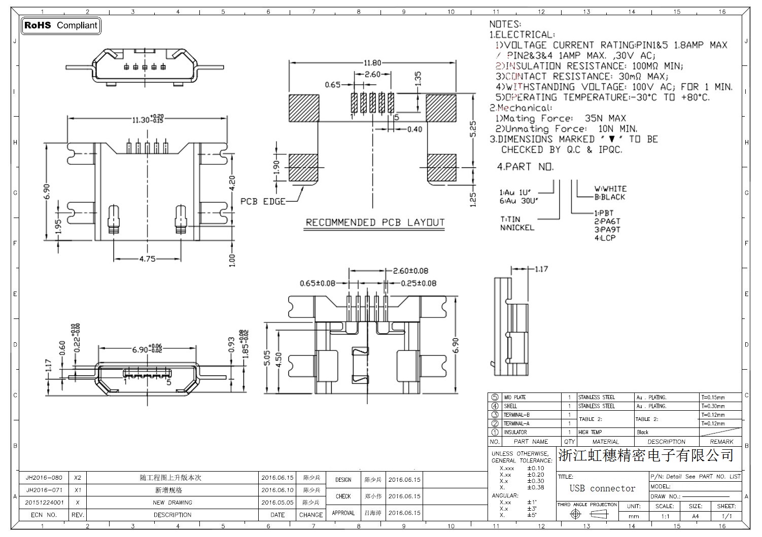 MICRO USB插座技術參數: