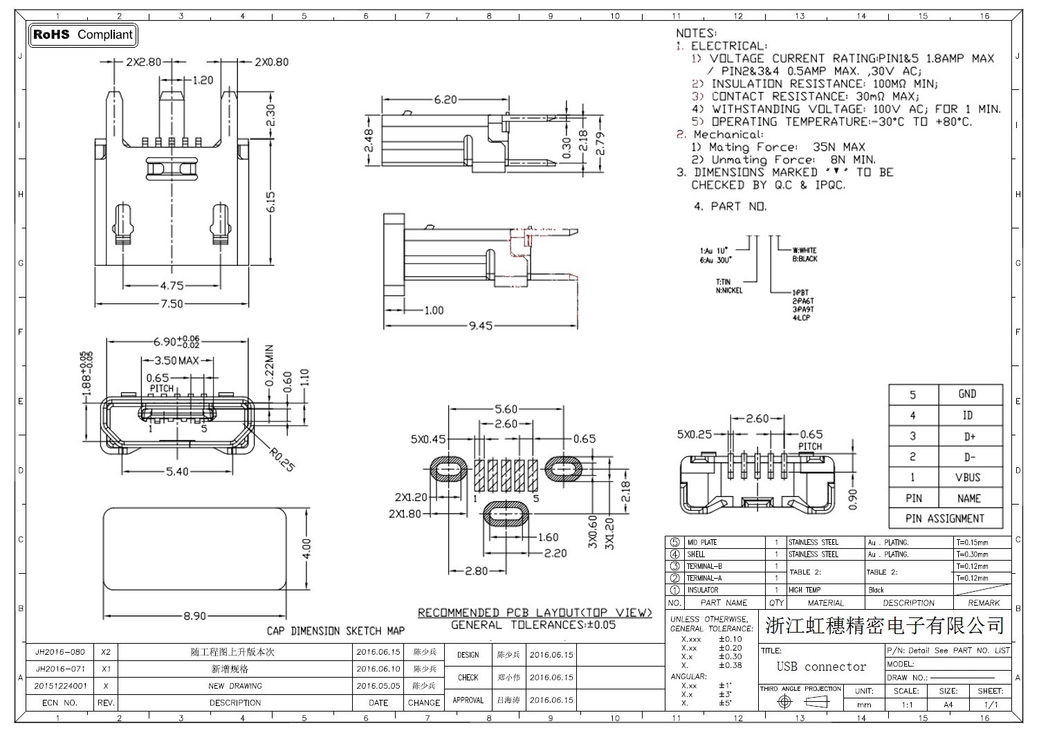 MICRO USB插座技術參數: