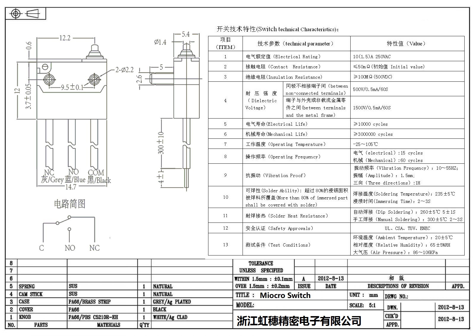 .請根據額定值電流、操作負載、驅動桿的種類、使用溫度等要求選擇合適型號的開關;