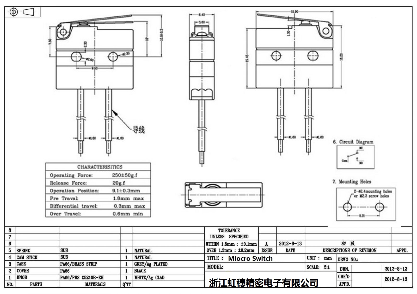 2.額定值:UL:5A125/250VAC 20T105 u 5E4