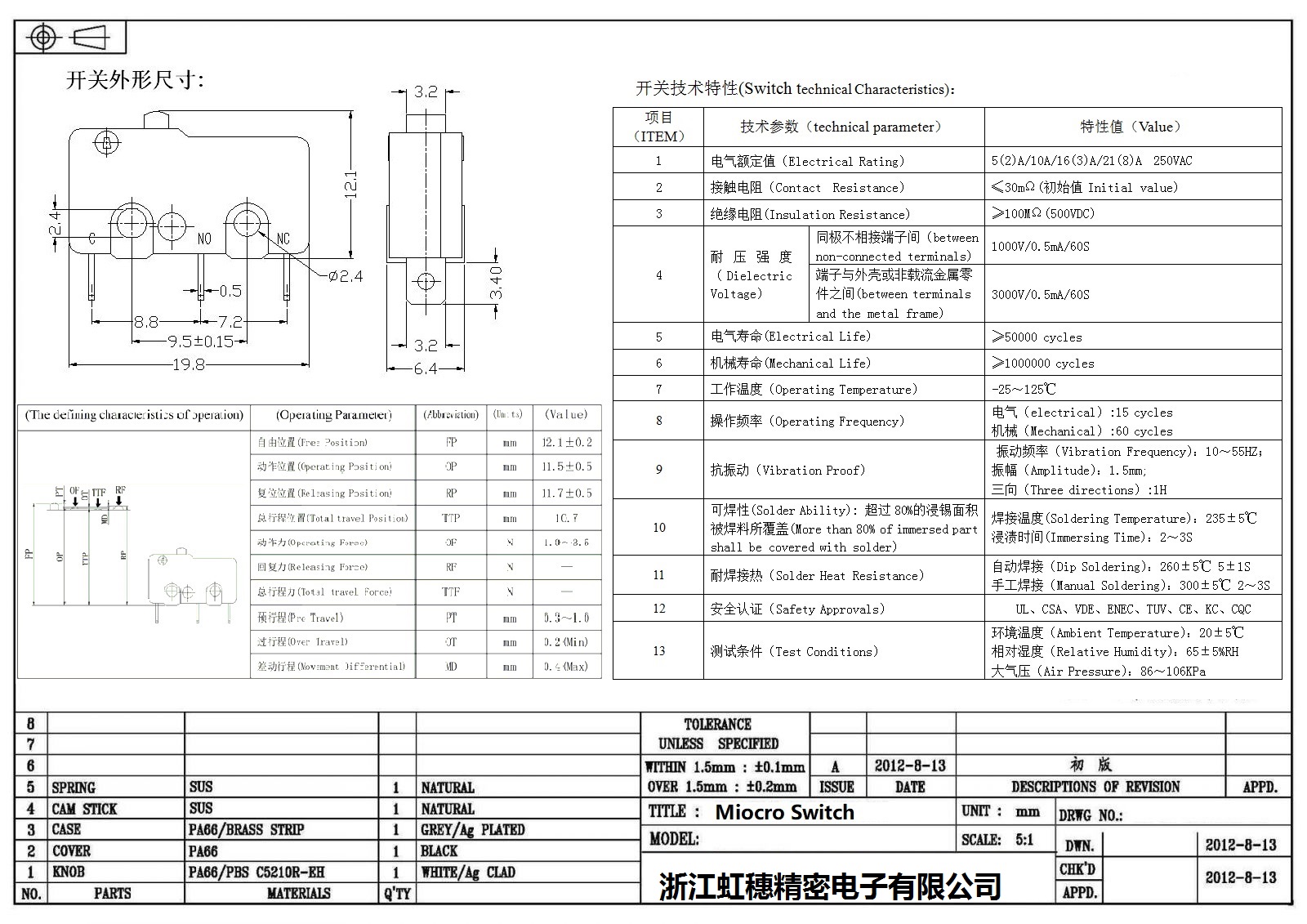 .請根據額定值電流、操作負載、驅動桿的種類、使用溫度等要求選擇合適型號的開關;